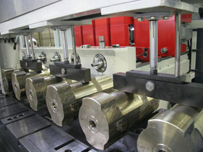 Tiefbohrmaschine mit 6 Spindeln für Bohrungen von 4 bis 12 mm Durchmesser bis zu 500 mm Tiefe. Anwendung: Bohren von Guss- und Bronzeformen für Glasflaschen.
