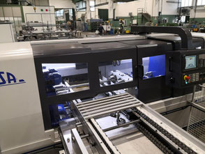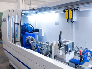 Tiefbohrmaschine für axialen Tiefbohrungen in zylindrischen Werkstücken (z. B. medizinische Komponenten, Temperatursonden, Luft- und Raumfahrtbolzen, Führungsrohre für Formen). Einspindel. Verfahren: Einlippenbohren. Werkstück in Gegenrotation. Bohrdurchmesser: 2–12 mm. Maximale Bohrtiefe: 600 mm (je nach Ø).
